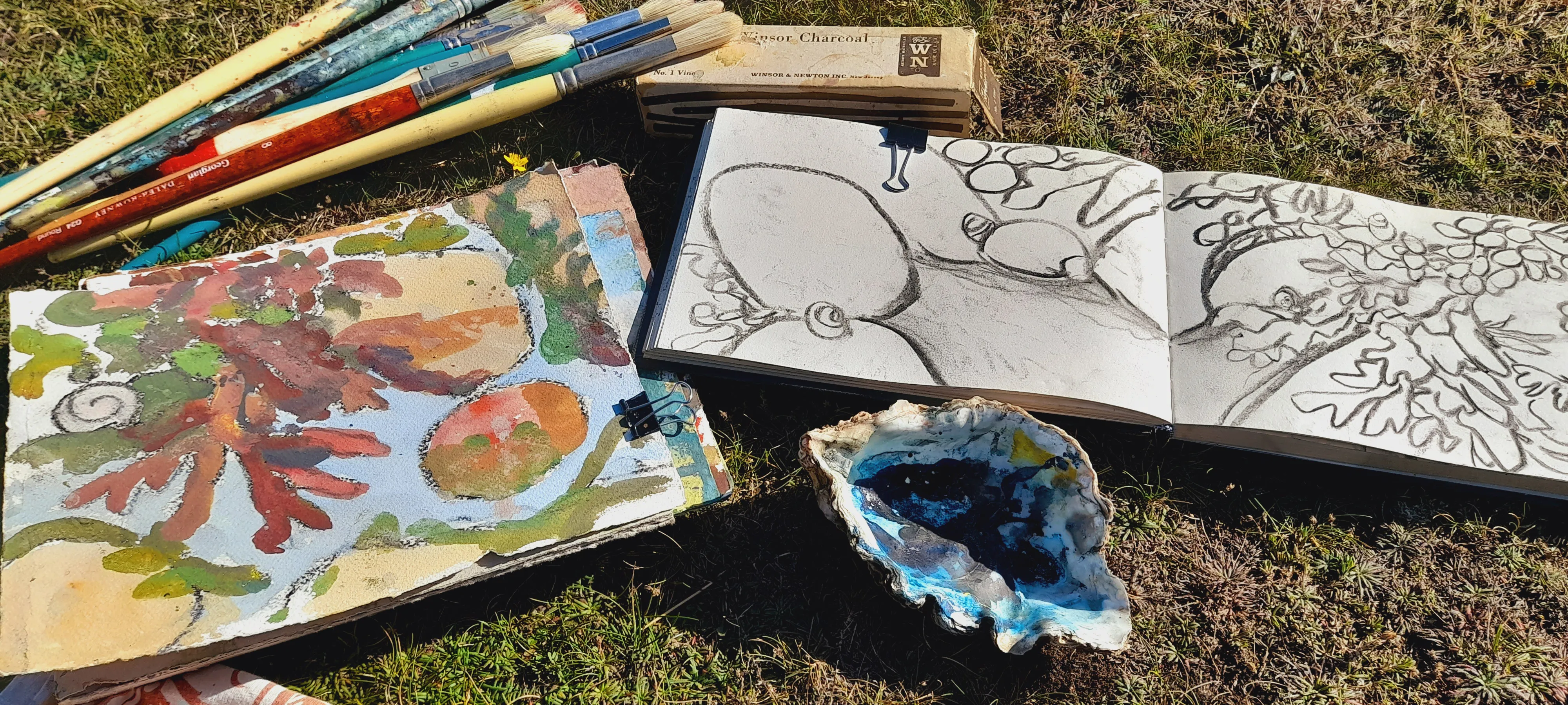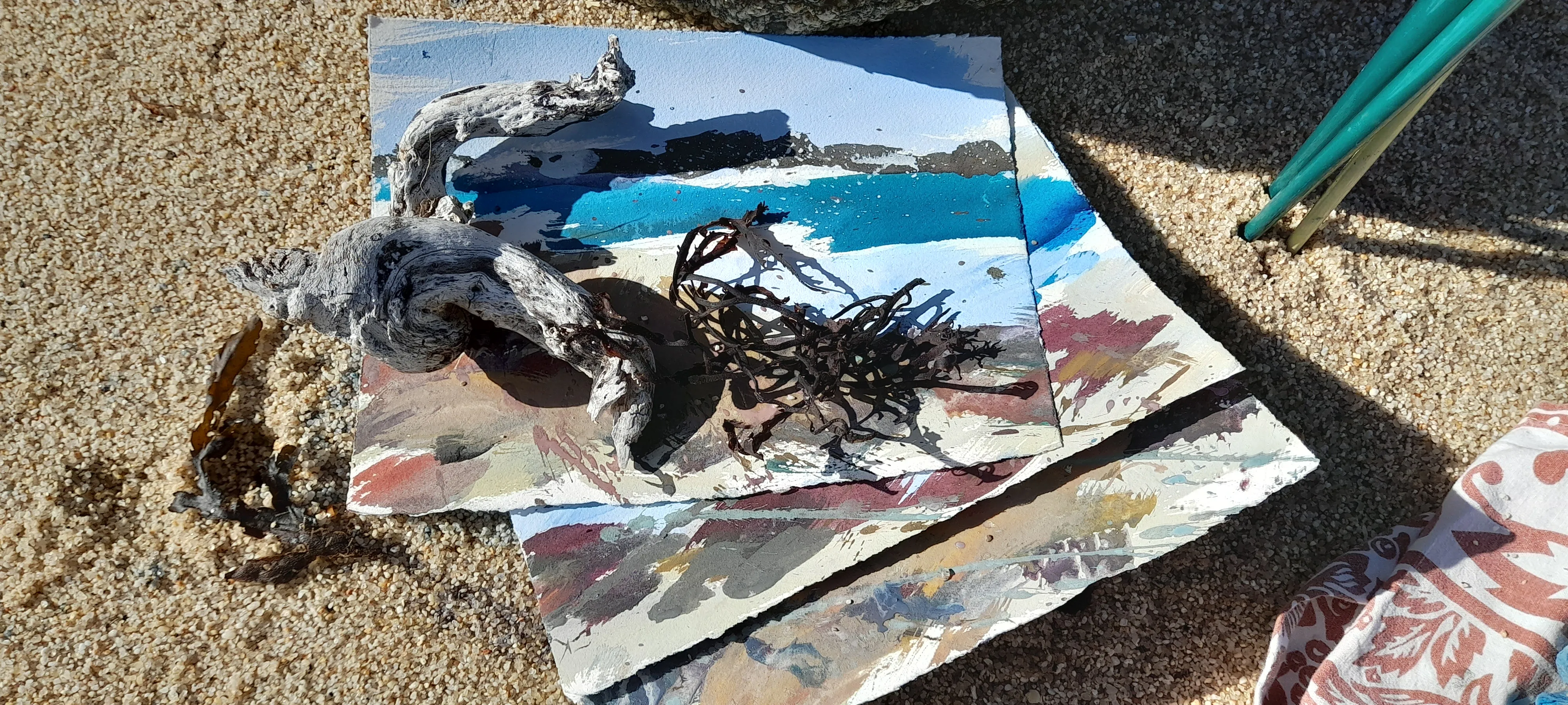 During an artist residency in St. Agnes on the Isles of Scilly, I spent a blissful day on the most perfect remote sunny beach, with a white seal pup for company. It felt like we were both waiting patiently for his mum to return from hunting. Quietly, deeply, I felt a universal truth, a feeling connected to everything. When confronted with the vastness, I looked to the rock pools to ground me, inspired by a friend's framed print by EQ Nicholson depicting a woodland rock study. I was seeking an objective reality that holds true across all contexts, cultures, and times, serving as an interconnected part of a larger whole. It was a unifying thread that stitched me to something so vast reminding us all that we are part of something greater. In North Norfolk, this truth appears in the saltmarsh and high-tides. Everything waits in time, seeing sunlight as well as the shadow.