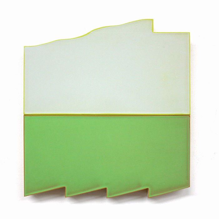 A single carefully chosen colour creates a lush colour field. However, there is a surgical precision at work here. Thomson cuts away material at the edges of her wooden panels. She slices through the substrate, shifting their presence on the wall from squared off regularity, toward being a one-off star of the show. The act of each cut lends a quiet ruthlessness to her paintings, registering a sharpening of intent. Once the form of the panel has been arrived at, Thomson applies tape to its edge to form a temporary barrier that she fills with liquid paint so that when dry, the surface maintains a pristine finish. This process is repeated for as many times as is deemed necessary, until the tape is removed revealing the chromatic layering that has built up over time.