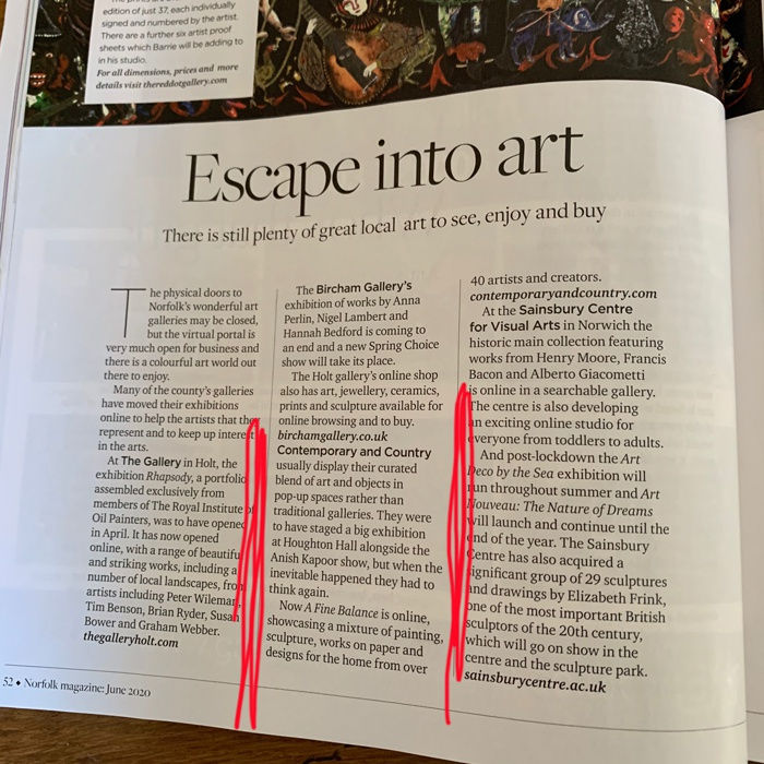 Thanks to Dominic Castle, Editor of Norfolk magazine. It's June edition, just published, features Contemporary and Country on pp52 and 53 - take a look when you get your copy of the magazine this month. We hope you enjoy the range of work we are able to show online, if there is an artist you are particularly interested in please let us know and we can put together a collection of their work for you to see on screen in the comfort of your own home.